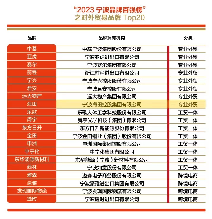 5月10日,“2023寧波品牌百強榜”正式發(fā)布,該榜單是由寧波市甬商發(fā)展研究會牽頭組織并聯(lián)合中國社科院品牌戰(zhàn)略研究課題組和中國市場學會、中國品牌研究中心等國內(nèi)權威機構共同主辦指導,被業(yè)界稱為寧波品牌界的“奧斯卡”獎,對寧波整體品牌形象的樹立起著重要作用。在此次榜單中,寧波海田控股集團有限公司榮登“2023寧波品牌百強榜”之對外貿(mào)易品牌Top20。